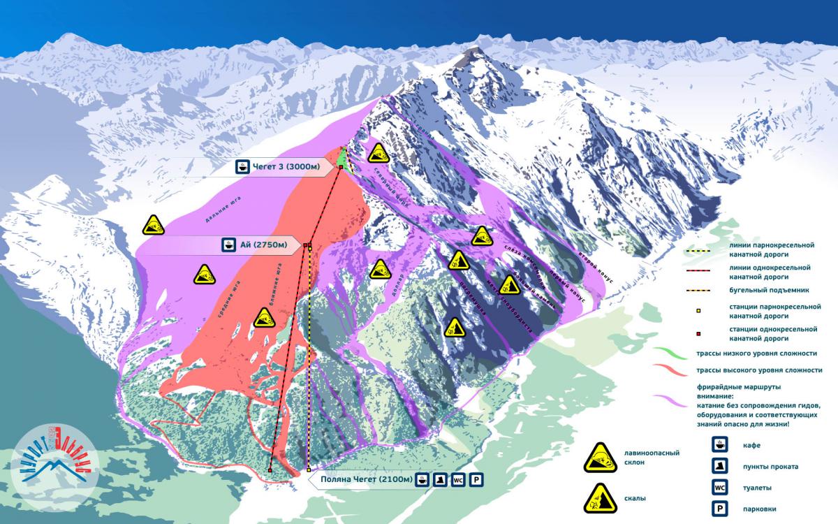 Трассы: В последнее время стали приводить в порядок – упорядочивать и кое-где расширять. Маркировка мало где есть, в тумане бывает люди выезжают далеко за трассу. Склон открыт для холодных ветров. Можно спуститься с 3000метров до поселка (1600м).
