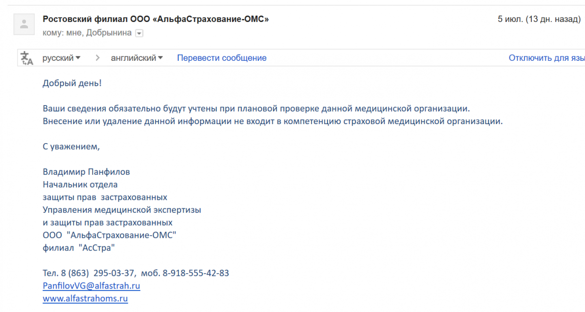 В начале месяца была направлена жалоба В Министерство Здравоохранения РФ с выпиской о фальшивых записях об услугах.