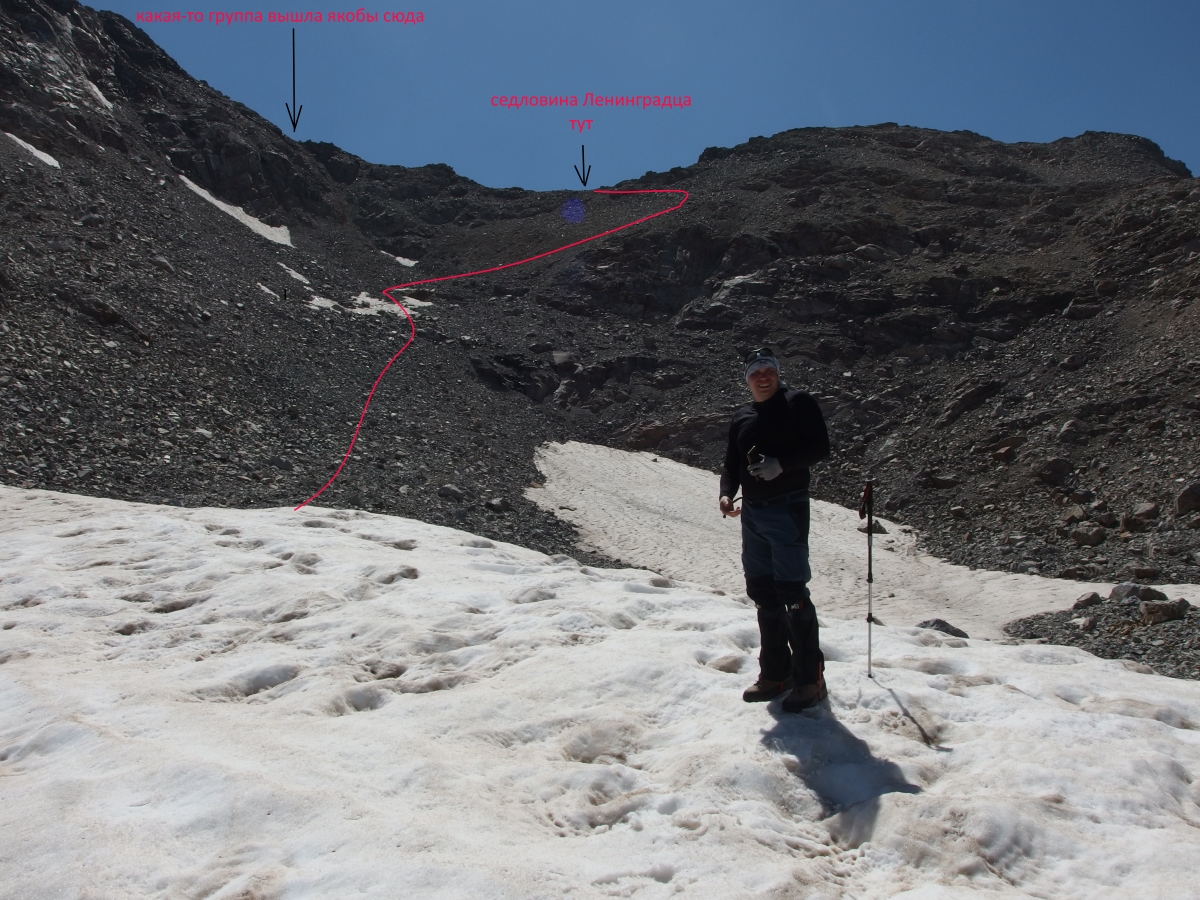 Мы с Лёхой явно шли наверх не единственным или самым лучшим путём, а всего лишь одним из возможных. Мне кажется, как бы ты ни поднимался, все пути по осыпному взлёту примерно равнозначны. А тот вариант, который выбрал Вася, более удобный в плане устойчивости, но чуть более длинный, поскольку по выходу на гребень хребта ему придётся идти к седловине перевала.